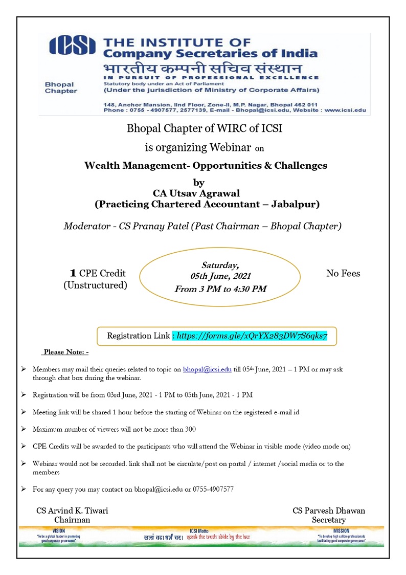 • Bhopal Chapter of WIRC of ICSI is organizing Webinar on Wealth Management- Opportunities & Challenges by CA Utsav Agrawal (Practicing Chartered Accountant – Jabalpur) on Saturday, 05th June, 2021 From 3 PM to 4:30 PM