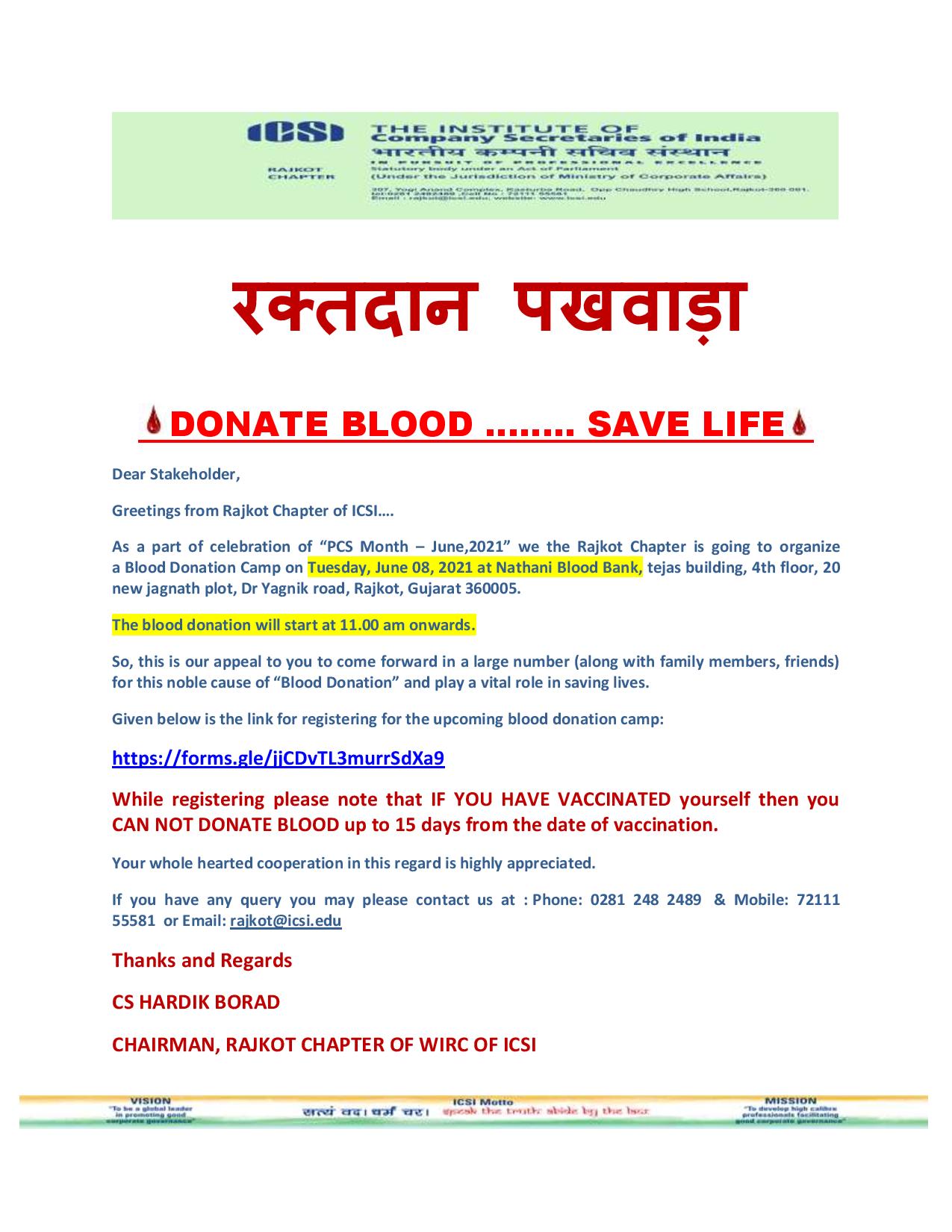 • RAJKOT CHAPTER - IS ORGANISING BLOOD DONATION CAMP TO CELEBRATE PCS MONTH JUNE,2021