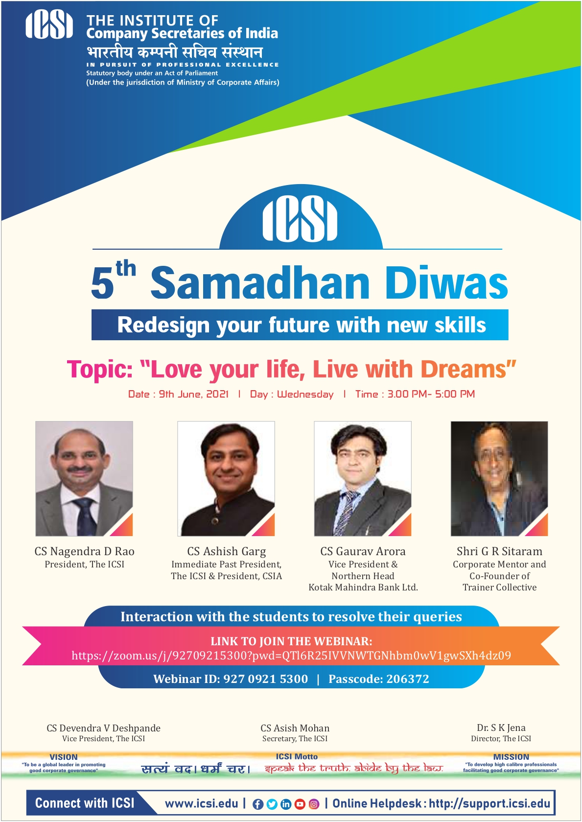 5 Samadhan Diwas Redesign your future with new skills Topic: “Love your life, Live with Dreams” Webinar ID: 927 0921 5300 | Passcode: 206372