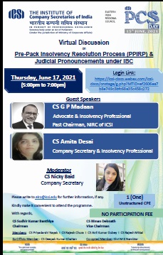 Virtual Discussion on "Pre-Pack Insolvency Resolution Process (PPIRP) & Judicial Pronouncements under IBC” on Thursday, 17th June, 2021