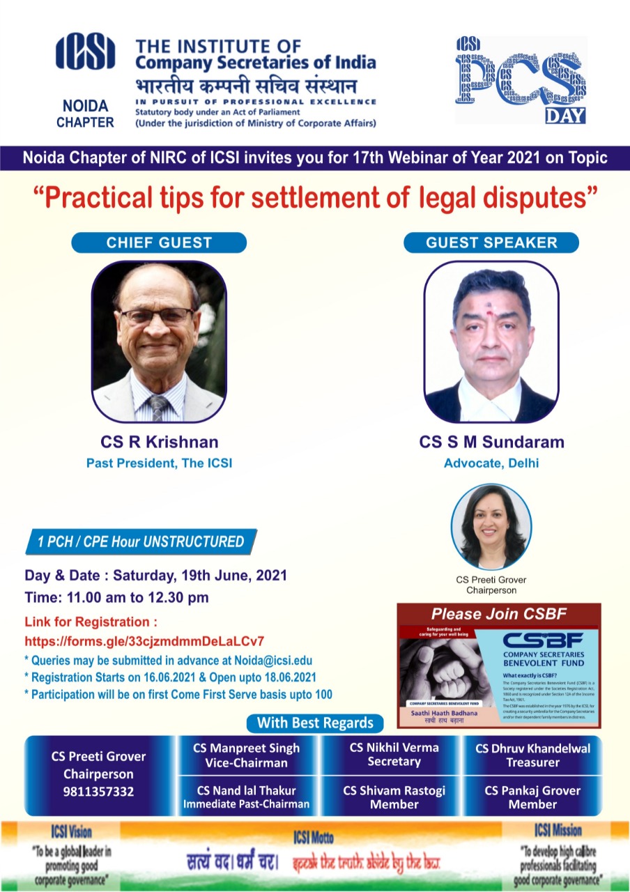 • Noida Chapter - Webinar on Saturday, 19th June, 2021 on topic “Practical Tips for Settlement of Legal Disputes”
