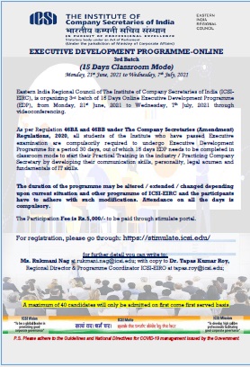 • EDP Online 3rd batch of Executive Development Programme of ICSI-EIRC from 21st June, 2021 to 7th July, 2021