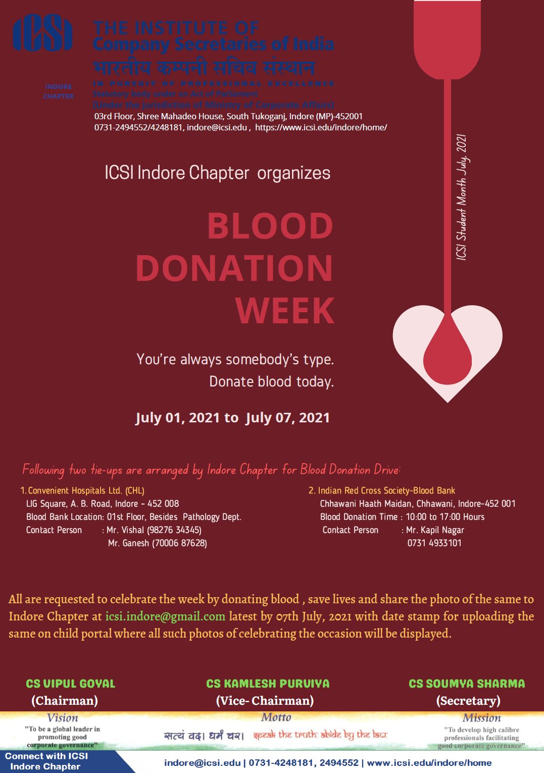 - INDORE CHAPTER of ICSI is organizing "BLOOD DONATION DRIVE" from 01.07.2021 to 07.07.2021
