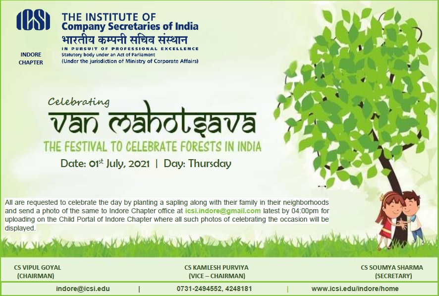 - All are requested to celebrate the day by planting a sapling along with their family in their neighborhoods and send a photo of the same to Indore Chapter office at icsi.indore@gmail.com latest by 04:00pm for uploading on the Child Portal of Indore Chapter where all such photos of celebrating the occasion will be displayed.