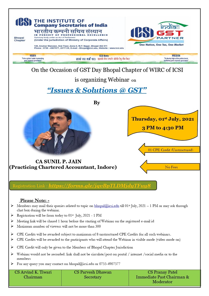 On the Occasion of GST Day Bhopal Chapter of WIRC of ICSI is organizing Webinar on “Issues & Solutions @ GST” on Thursday, 01st July, 2021 from 3 PM to 4:30 PM