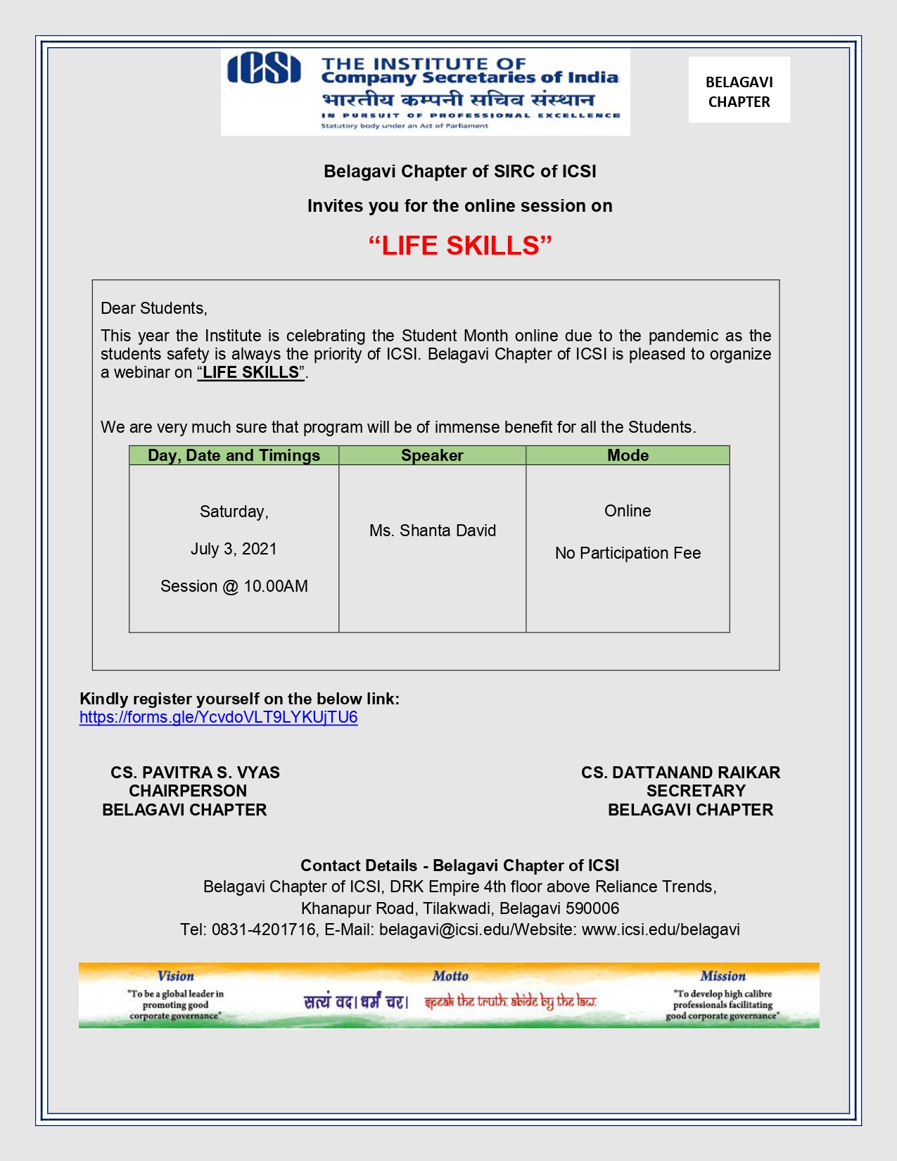 Belagavi Chapter of SIRC of ICSI Invites you for the online session on “LIFE SKILLS”