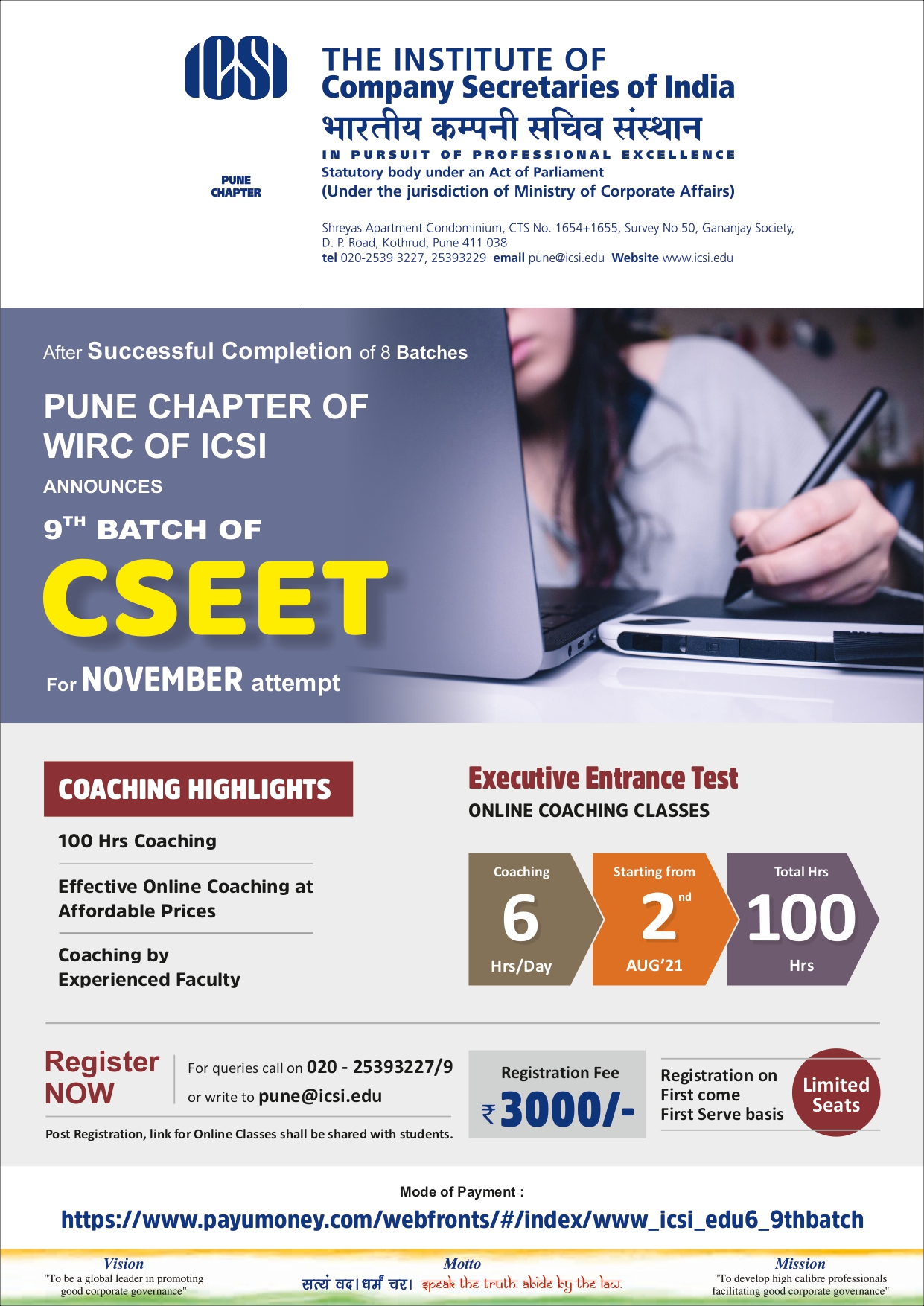• 9th batch of CSEET for November Attempt * 100 Hours of Coaching * Effective Online Coaching at Affordable Prices * Coaching by Experienced Faculty *Registration Fee 3000/- * For queries call on 020 - 25393227/9 or write to pune@icsi.edu