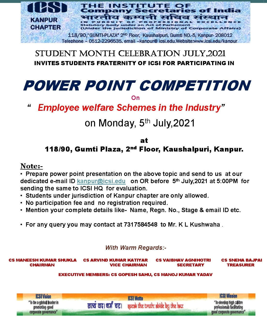 • Note:- (i) Prepare power point presentation on the above topic and send to us at our dedicated e-mail ID kanpur@icsi.edu on OR before 5th July,2021 at 5:00PM for sending the same to ICSI HQ for evaluation. (ii) Students under jurisdiction of Kanpur chapter are only allowed. (iii) No participation fee and no registration required. (iv) Mention your complete details like- Name, Regn. No., Stage & email ID etc. (v) For any query you may contact at 7317584548 to Mr. K L Kushwaha .