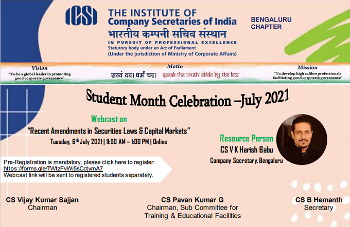 Organising a Webcast on "Recent Amendments in Securities Laws & Capital Markets". Pre-Registration is Mandatory. Click here to register > https://forms.gle/TWtzFvWj5sCctymA7
