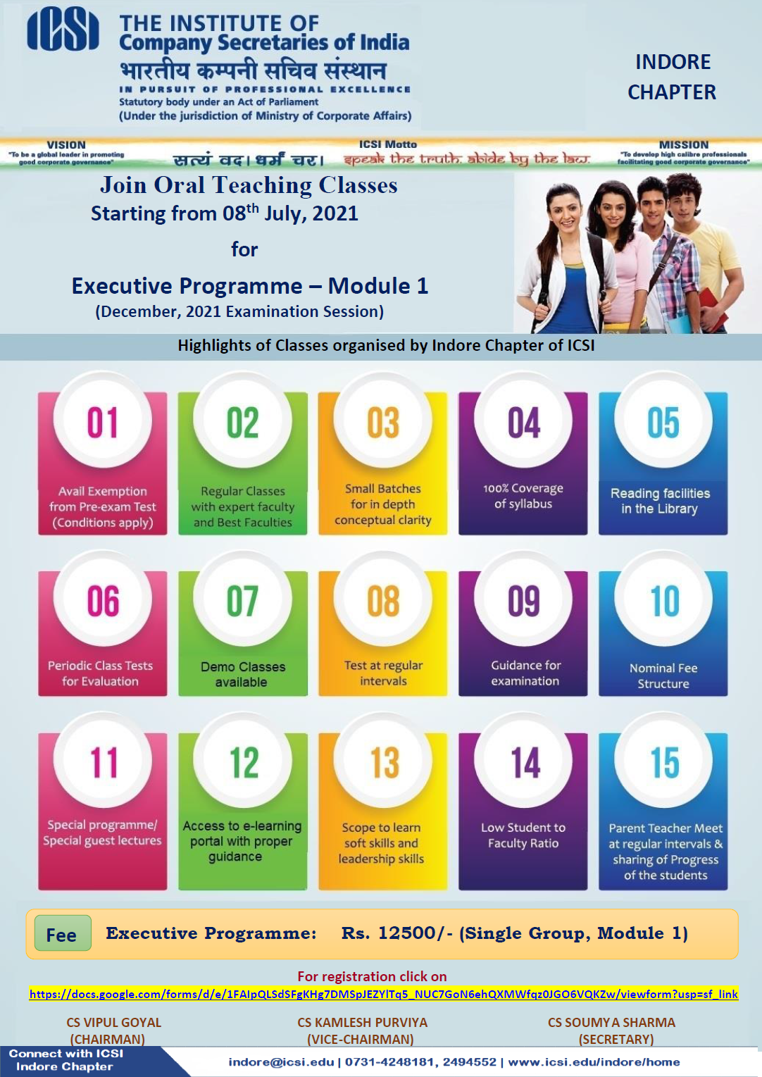 Join online Executive- Module 1 classes at Indore Chapter from 08.07.2021 at affordable fee with 03 Days Trial Do Register yourself by clicking on mentioned link