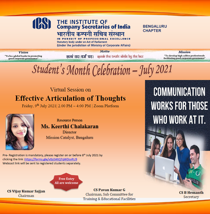 - Organising the Soft Skill Development Progamme on "Effective Articulation Thoughts". Pre-registration is mandatory, please click here to register > https://forms.gle/vtbJ34tQ7qWDsvRU9