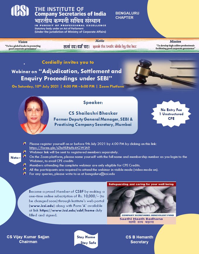 • Organising a Webinar on “Adjudication, Settlement and Enquiry Proceedings under SEBI” | Saturday, 10th July 2021 | 4:00 PM to 6:00 PM | Online. Pre-registration is mandatory. Click here to register > https://forms.gle/sZhsHUHuHc4tGWJA9
