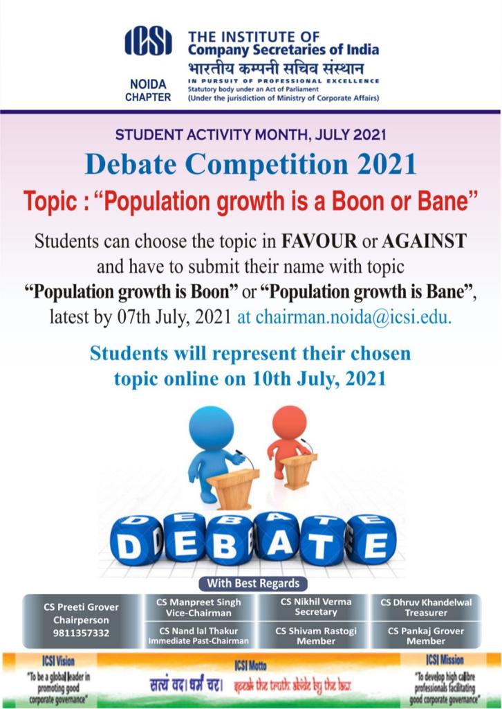 Noida Chapter - Debate Competition 2021, Topic: Population growth is a Boon or Bane" Submit latest by 07.07.2021 Result will be declared on 10.07.2021