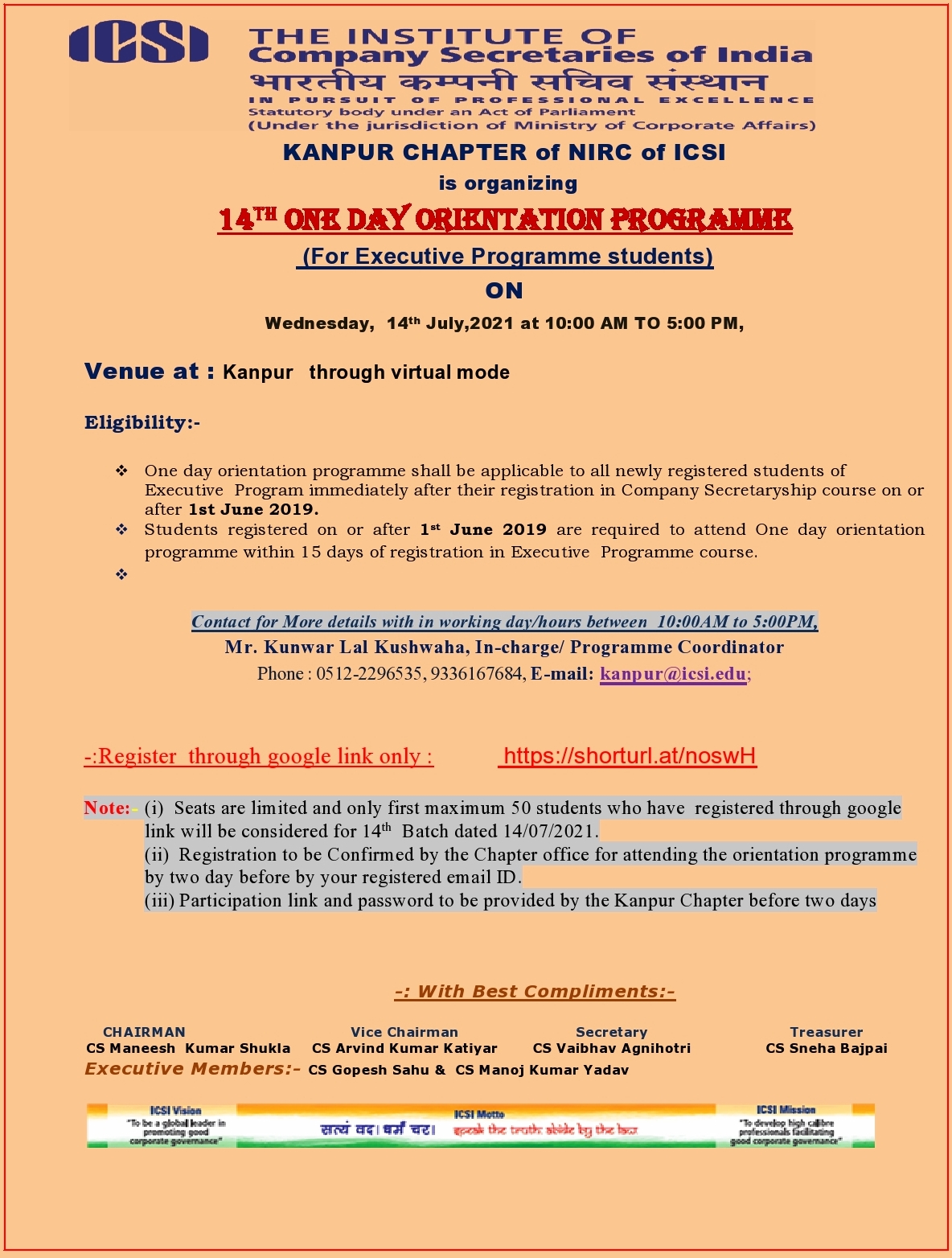 -One day orientation programme shall be applicable to all newly registered students of Executive Program immediately after their registration in Company Secretaryship course on or after 1st June 2019.