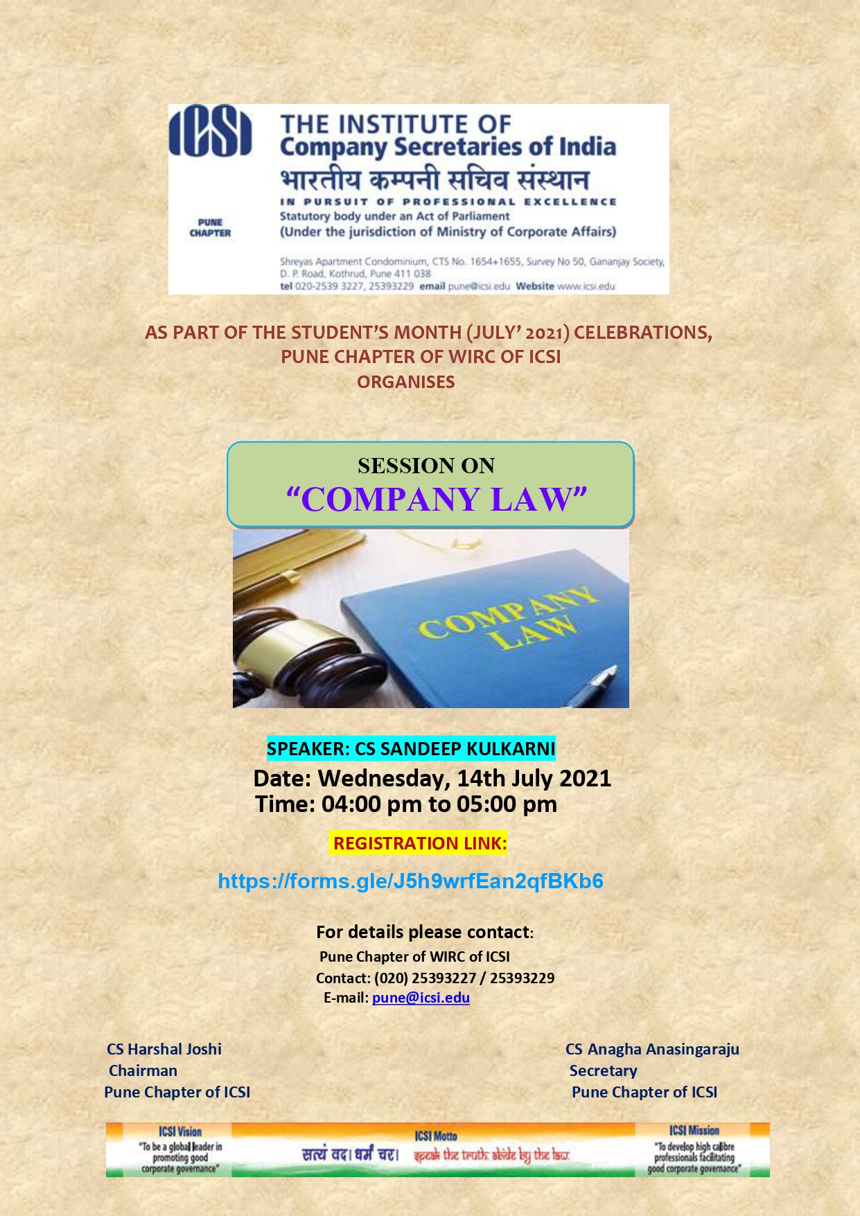 AS PART OF THE STUDENT’S MONTH (JULY’ 2021) CELEBRATIONS, PUNE CHAPTER OF WIRC OF ICSI ORGANISES SESSION ON "COMPANY LAW". SPEAKER: CS SANDEEP KULKARNI.