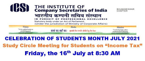 - Bhubaneswar Chapter during the students month celebration July 2021 is organising a study circle meeting for the students on Income Tax on 16th July 2021 at 8:30 AM. For participation and link to join please contact 0674-2552282 /2551139 / Mobile No. 9040679082 / 9090946976
