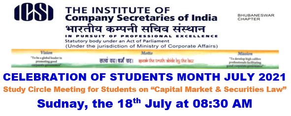 Bhubaneswar Chapter during the students month celebration July 2021 is organising a study circle meeting for the students on "Securities Laws and Capital Market" on 18th July 2021 at 8:30 AM. For participation and link to join please contact 0674-2552282 /2551139 / Mobile No. 9040679085 / 9090946976