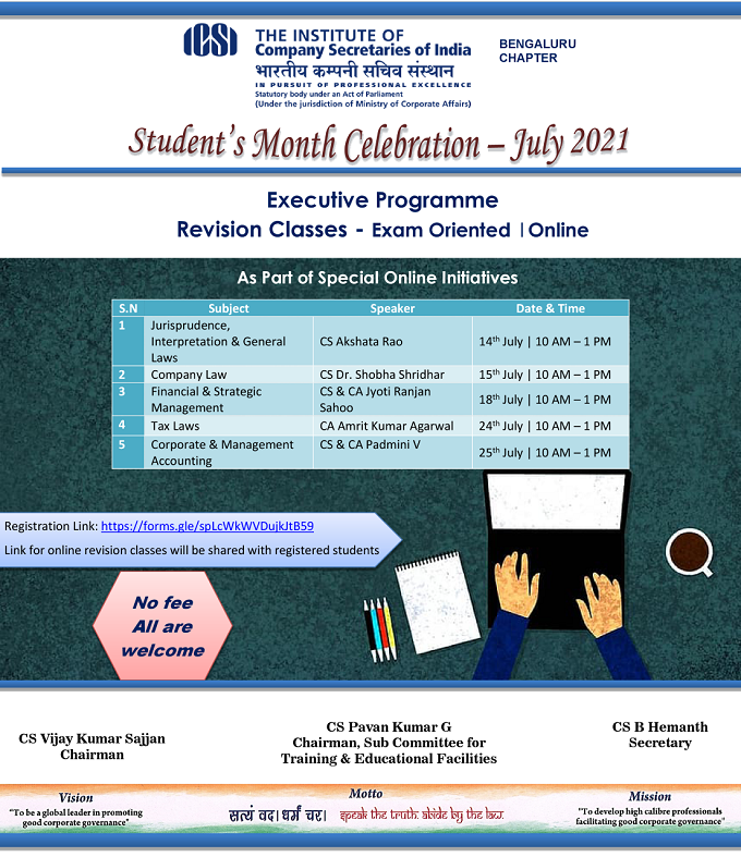 • On account of Student Month Celebration, we are conducting the Revision Classes for Students of Executive Programme. Pre-Registration is mandatory. Please click here to register > https://forms.gle/spLcWkWVDujkJtB59