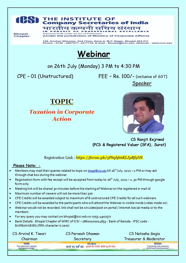 Bhopal Chapter is organizing Webinar on Taxation in Corporate Action on 26th July, 2021 (Monday) from 3 PM to 4:30 PM by Eminent Speaker CS Ranjit Kejriwal (PCS & Registered Valuer (SFA), Surat)