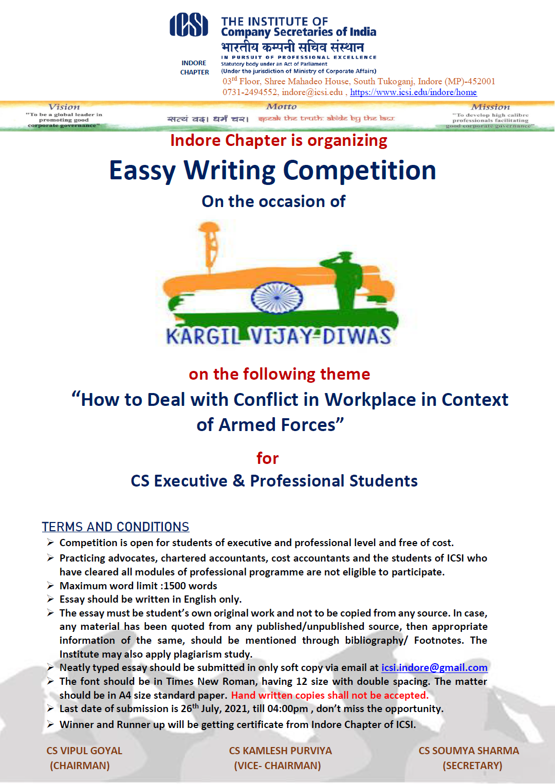 • INDORE CHAPTER of ICSI is organizing "ESSAY WRITING COMPETITION" on 26.07.2021 Competition is open for registered students of ICSI and free of cost .Kindly clicking on mentioned link for details