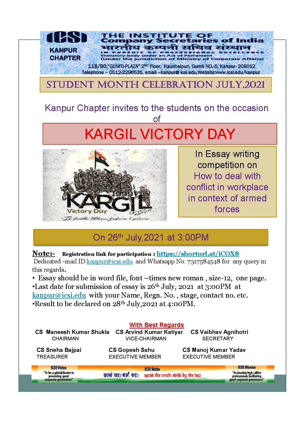 • Kanpur Chapter - Kargil Victory Day, Essay Writing competition on 26/07/2021