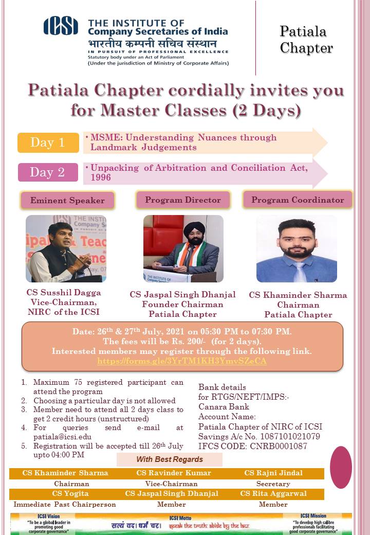 • Two Days Master Classes through virtual mode. Fees will Rs. 200/- (Both Days) 2 Credit Hours (Unstructured) Registration Link https://docs.google.com/forms/d/e/1FAIpQLSfhZMUIZ_cYjwn5ePFAxzDLRbK_oIkR0ZPrfPc8Nr0xBDJ7zQ/viewform For more details kindly visit child portal of Patiala Chapter