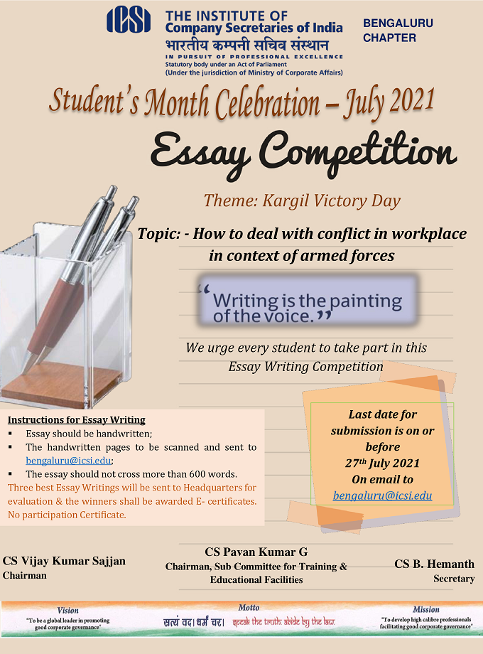 Organising Essay Writing Competition on account of Student Month Celebration - July 2021. Last date for submission Essay is 27th July 2021.