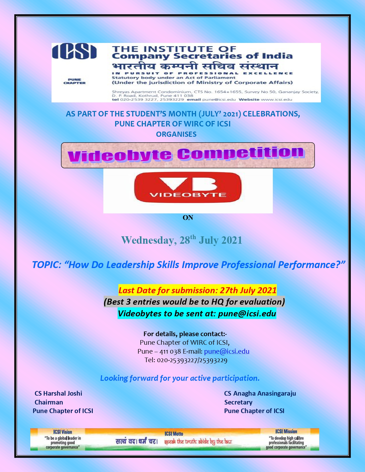 - AS PART OF THE STUDENT’S MONTH (JULY’ 2021) CELEBRATIONS, PUNE CHAPTER OF WIRC OF ICSI ORGANISES ON Wednesday, 28th July 2021