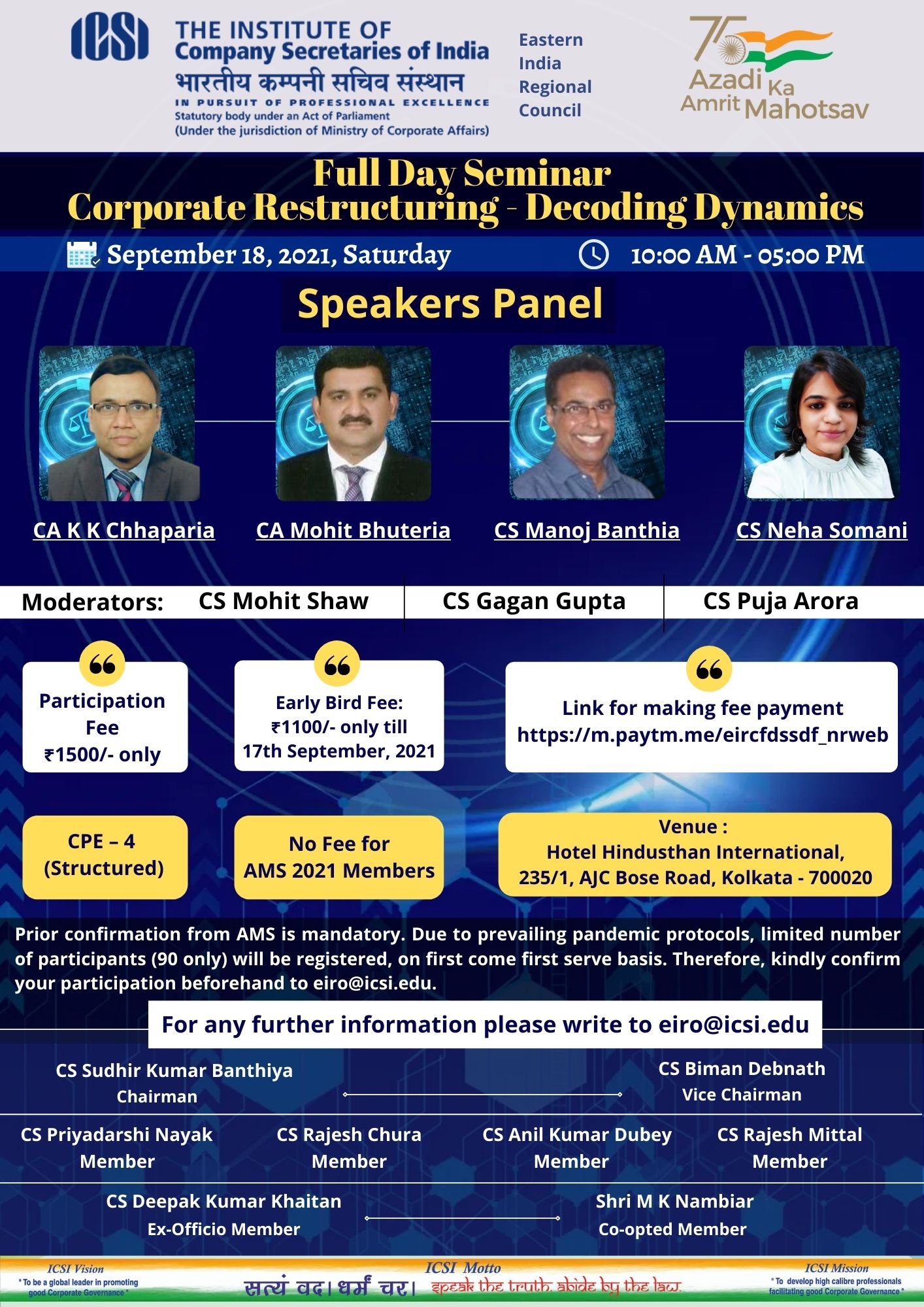 EIRC's Full Day Seminar on Corporate Restructuring on Saturday,18th September, 2021 at HHI, Kolkata