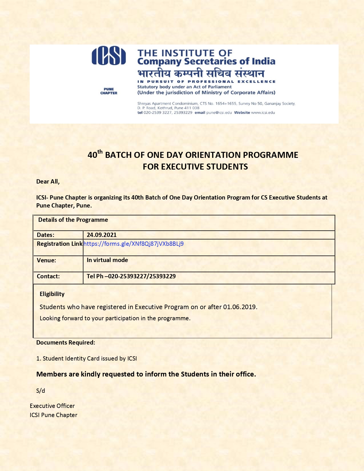 ICSI- Pune Chapter is organizing its 40th Batch of One Day Orientation Program for CS Executive Students at Pune Chapter, Pune.