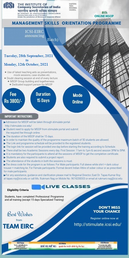 EIRC's 8th Online Management Skills Development Programme from 28th September, 2021 to 12th October, 2021