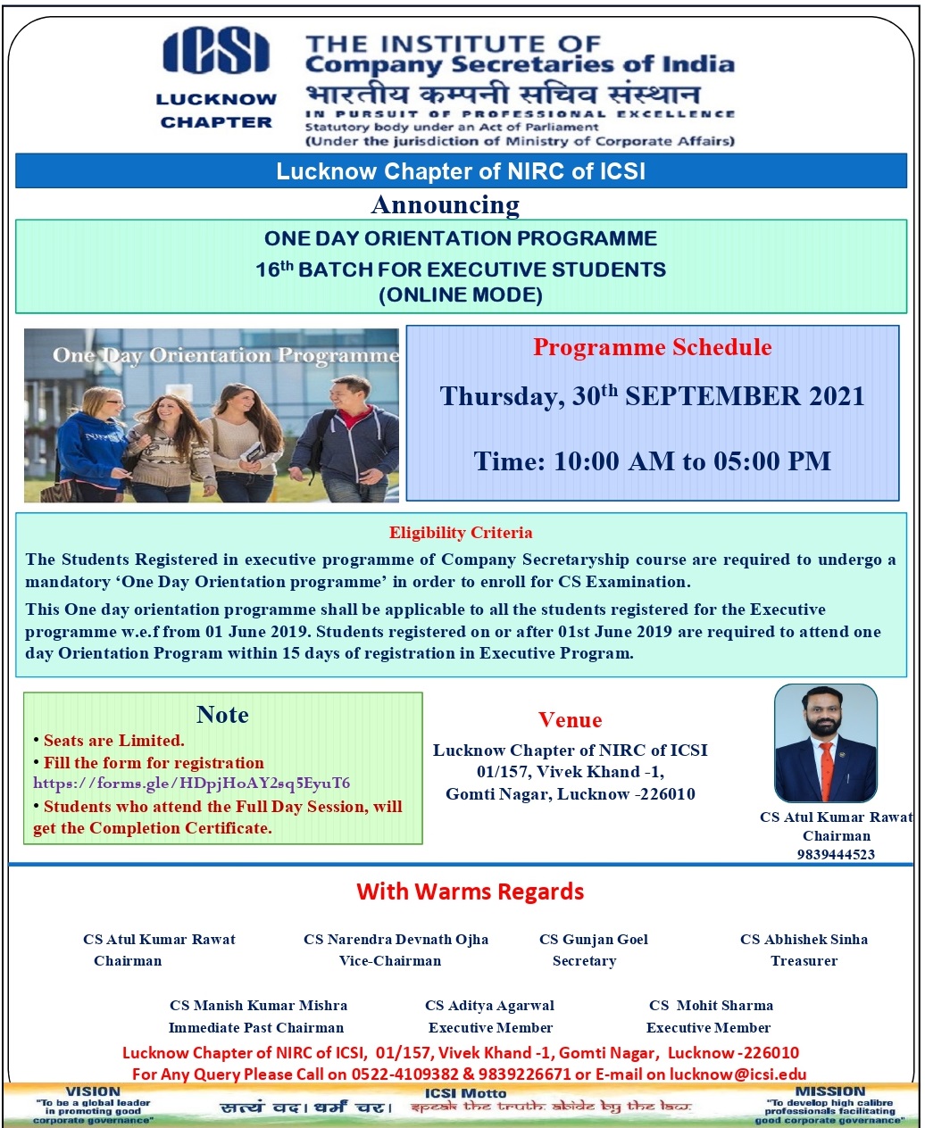 16th One Day Orientation programme for Executive Stage Students on 30 September 2021 From 10:00 AM to 05:00 PM