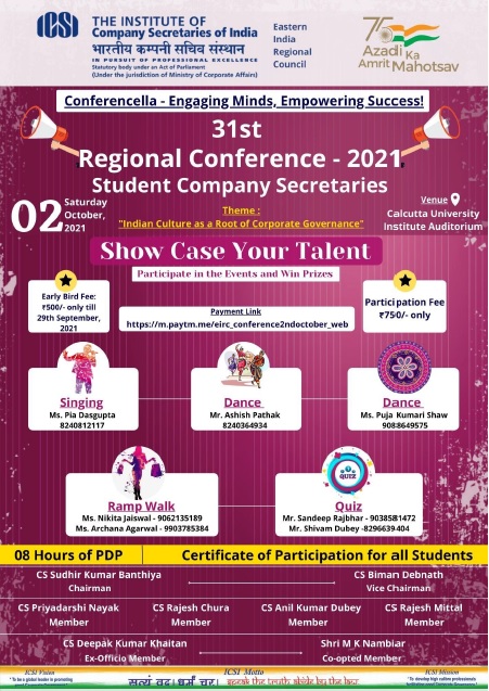 EIRC's 31st Regional Conference of Student Company Secretaries on Saturday, 2nd October, 2021 at Calcutta University Institute Auditorium, Kolkata