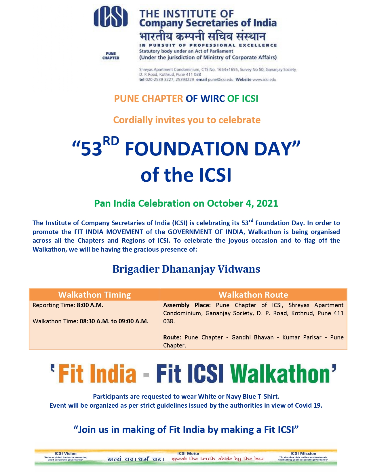 - The Institute of Company Secretaries of India (ICSI) is celebrating its 53rd Foundation Day. In order to promote the FIT INDIA MOVEMENT of the GOVERNMENT OF INDIA, Walkathon is being organised across all the Chapters and Regions of ICSI. To celebrate the joyous occasion and to flag off the Walkathon, we will be having the gracious presence of: Brigadier Dhananjay Vidhwans.