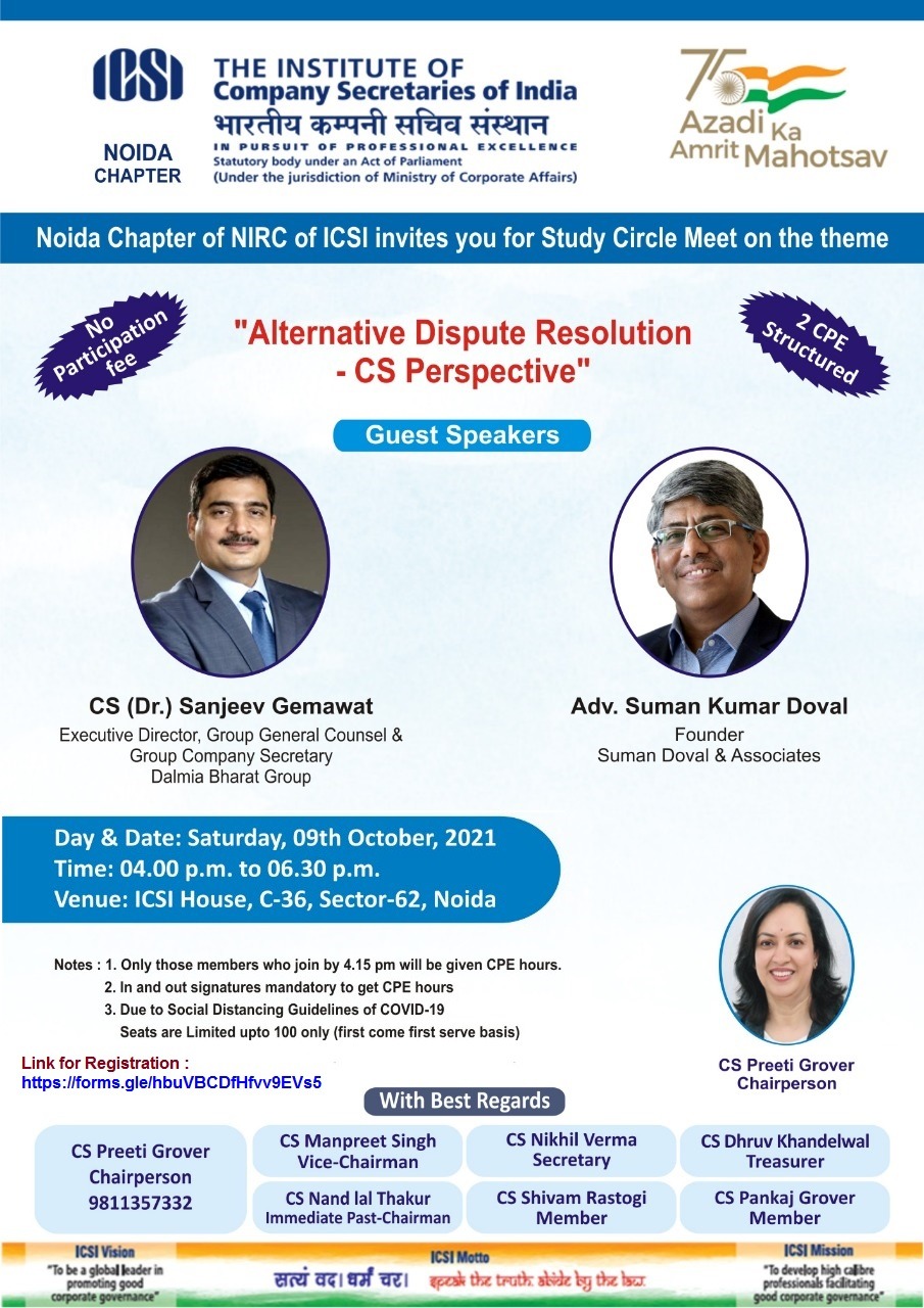 Noida Chapter - Study Circle Meeting on topic "Alternative Dispute Resolution - CS Perspective" on 09.10.2021
