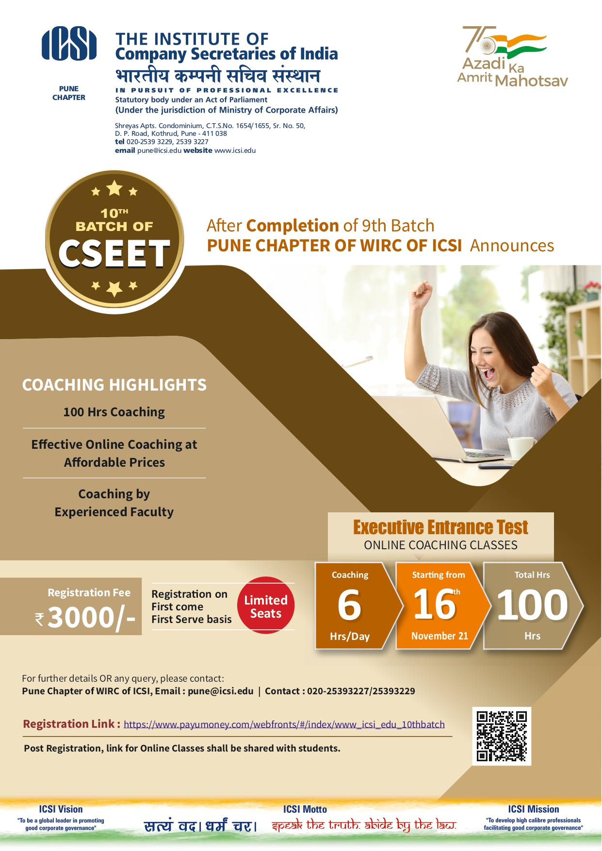 After completion of 9th batch, PUNE CHAPTER OF WIRC OF ICSI Announces 10TH BATCH OF CSEET starting from 16th November 2021, daily 6 hours coaching, total duration 100 hours. Registration Fee 3000/-