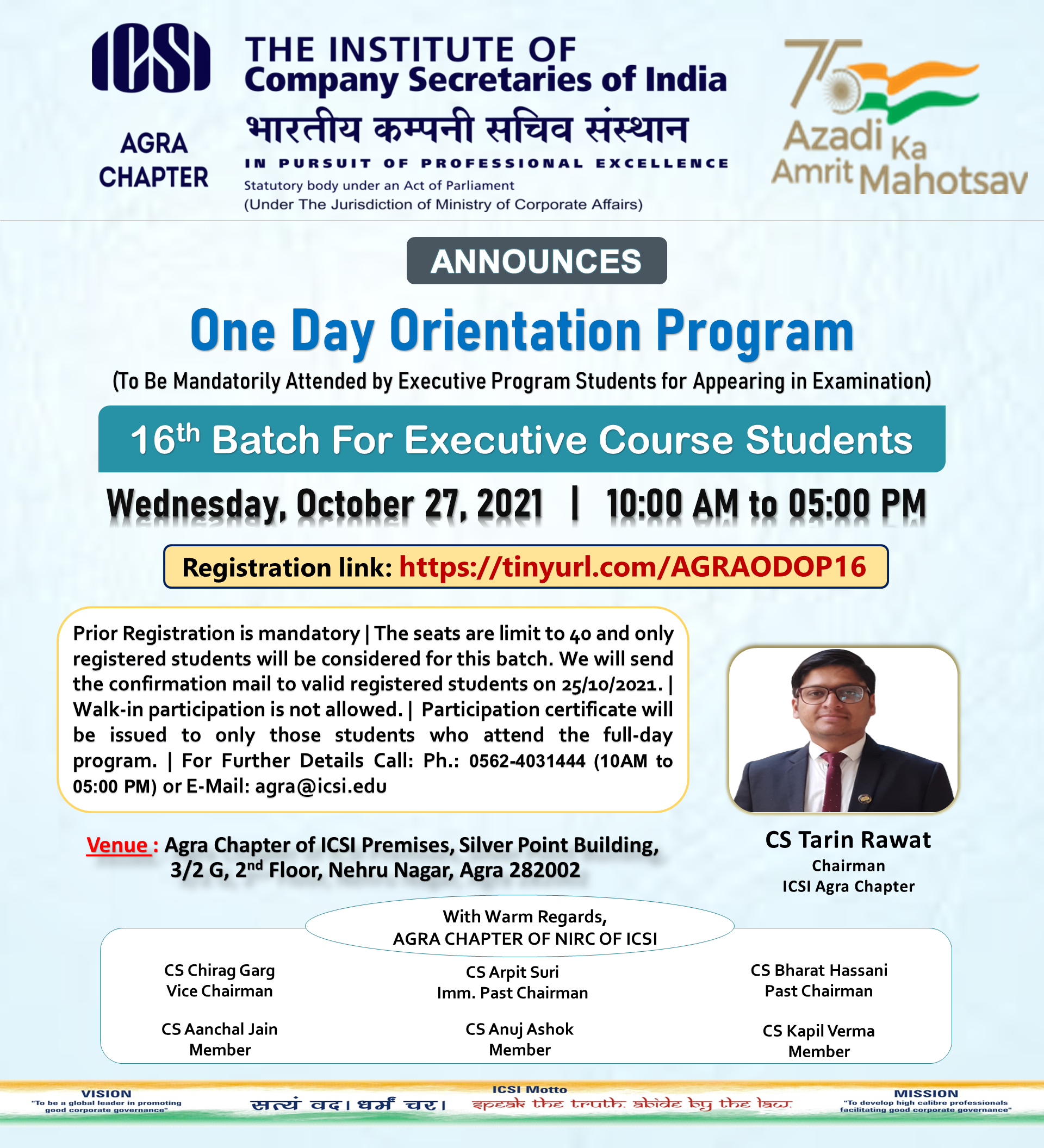 - Prior Registration is mandatory | The seats are limit to 40 and only registered students will be considered for this batch. We will send the confirmation mail to valid registered students on 25/10/2021. | Walk-in participation is not allowed. | Participation certificate will be issued to only those students who attend the full-day program. | For Further Details Call: Ph.: 0562-4031444 (10AM to 05:00 PM) or E-Mail: agra@icsi.edu