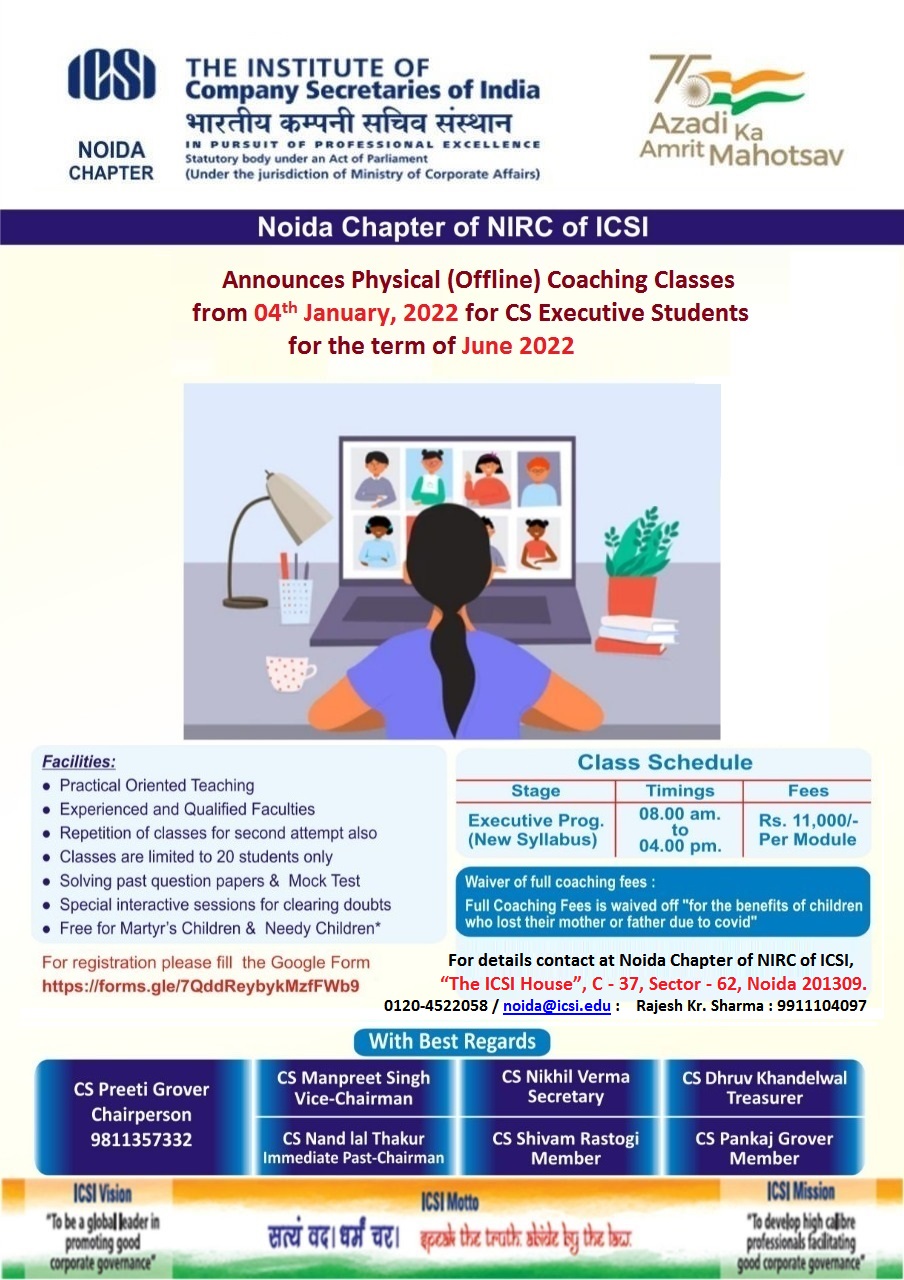 Noida Chapter of NIRC of ICSI Announces Physical (Offline) Coaching Classes From 04th January, 2022 for CS Executive Students for the term of June 2022.