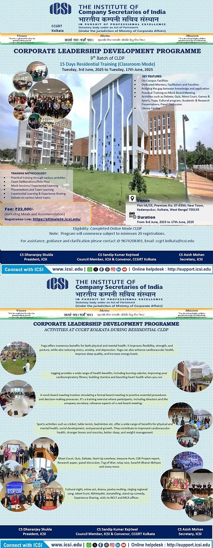 • 9th Batch of Residential Corporate Leadership Development Programme 15 Days Residential Training (Classroom Mode) Thursday, 29th May, 2025 to Thursday, 12th June, 2025