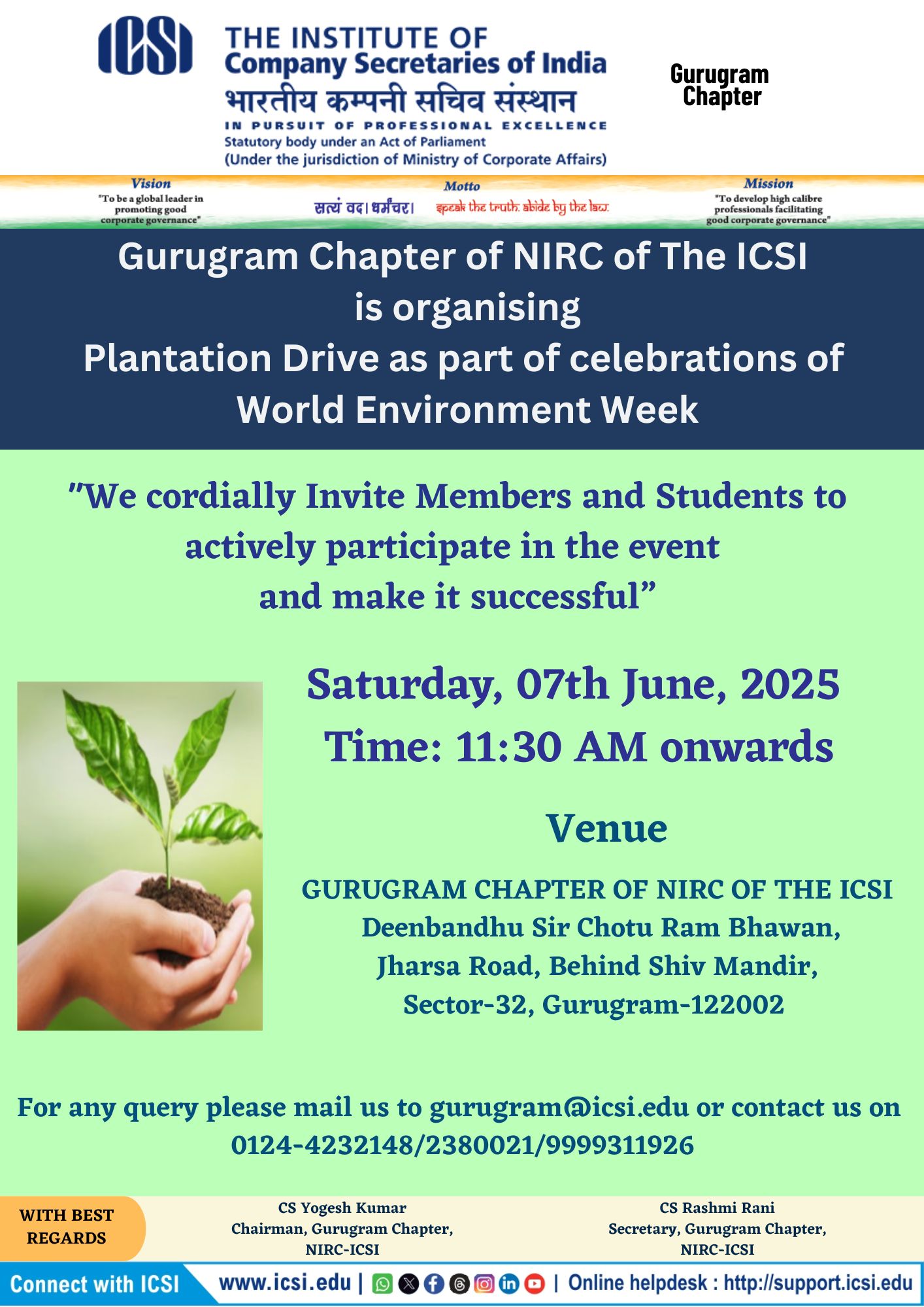 - Plantation Drive as part of celebrations of World Environment Week on Saturday,07th June 2025 at 11:30 am onwards