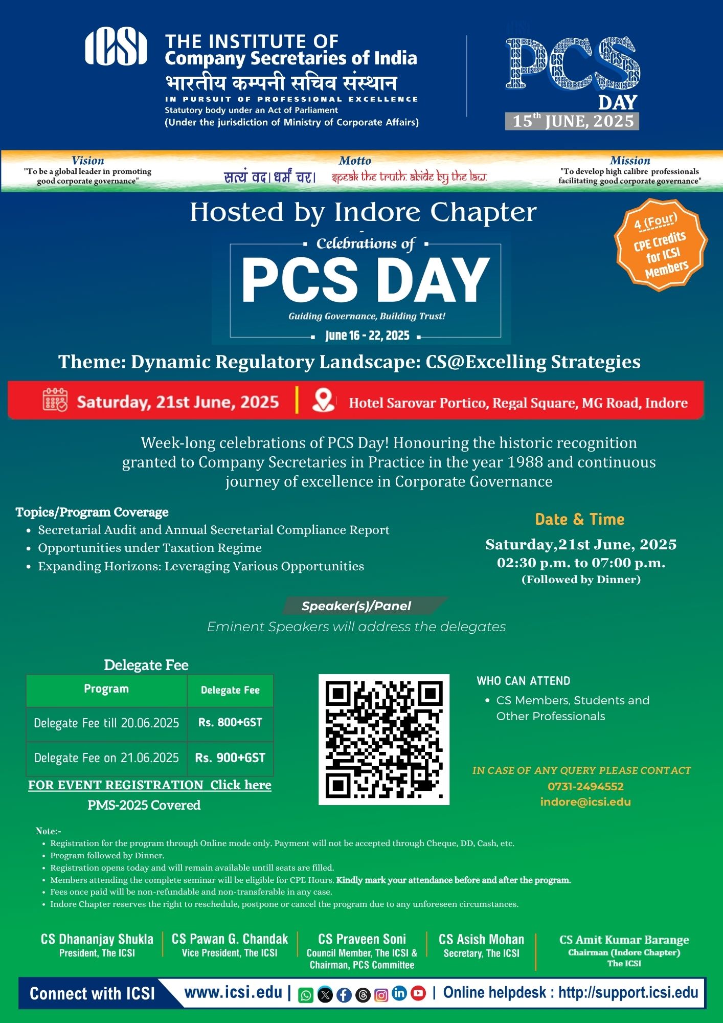 We are pleased to share that it has been decided that all CCGRTs, Regions & Chapters shall actively be engaged in the week-long celebrations of the PCS Day. The PCS Week shall be celebrated during 16th to 22nd June, 2025 across all CCGRTs, Regions and Chapters. The theme for this year celebration is “Dynamic Regulatory Landscape: CS @ Excelling Strategies”. Accordingly, ICSI Indore Chapter is organising a program in the form of panel discussions on following sub-themes: