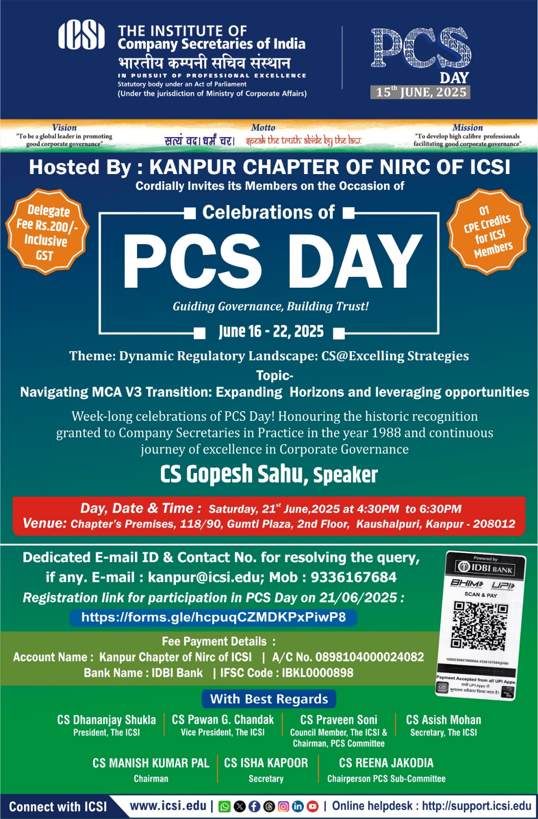 Phone : 0512-2296535, 9336167684, E-mail: kanpur@icsi.edu;