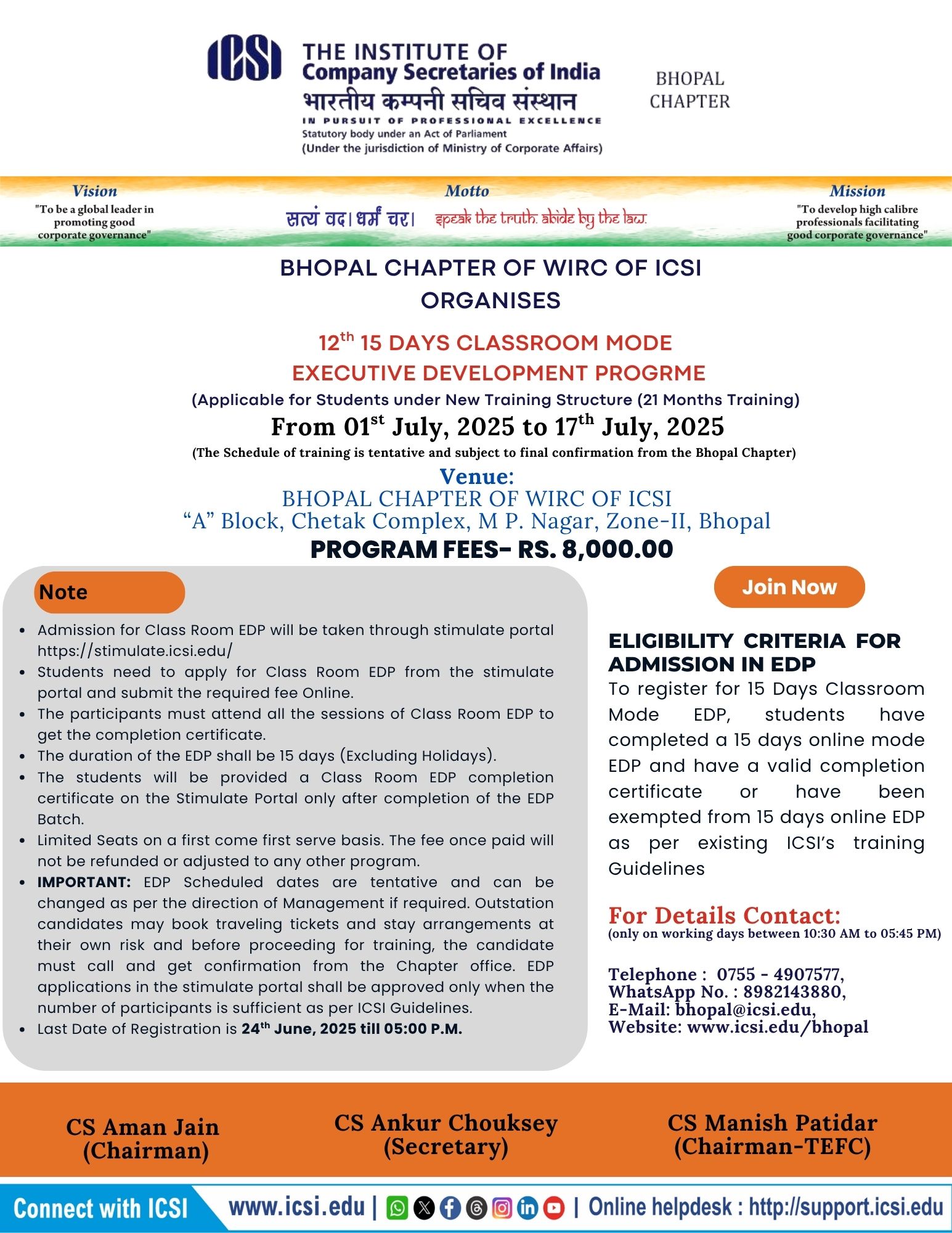 • Bhopal 12th 15 Days Classroom Mode EDP from 01.07.2025 to 17.07.2025.