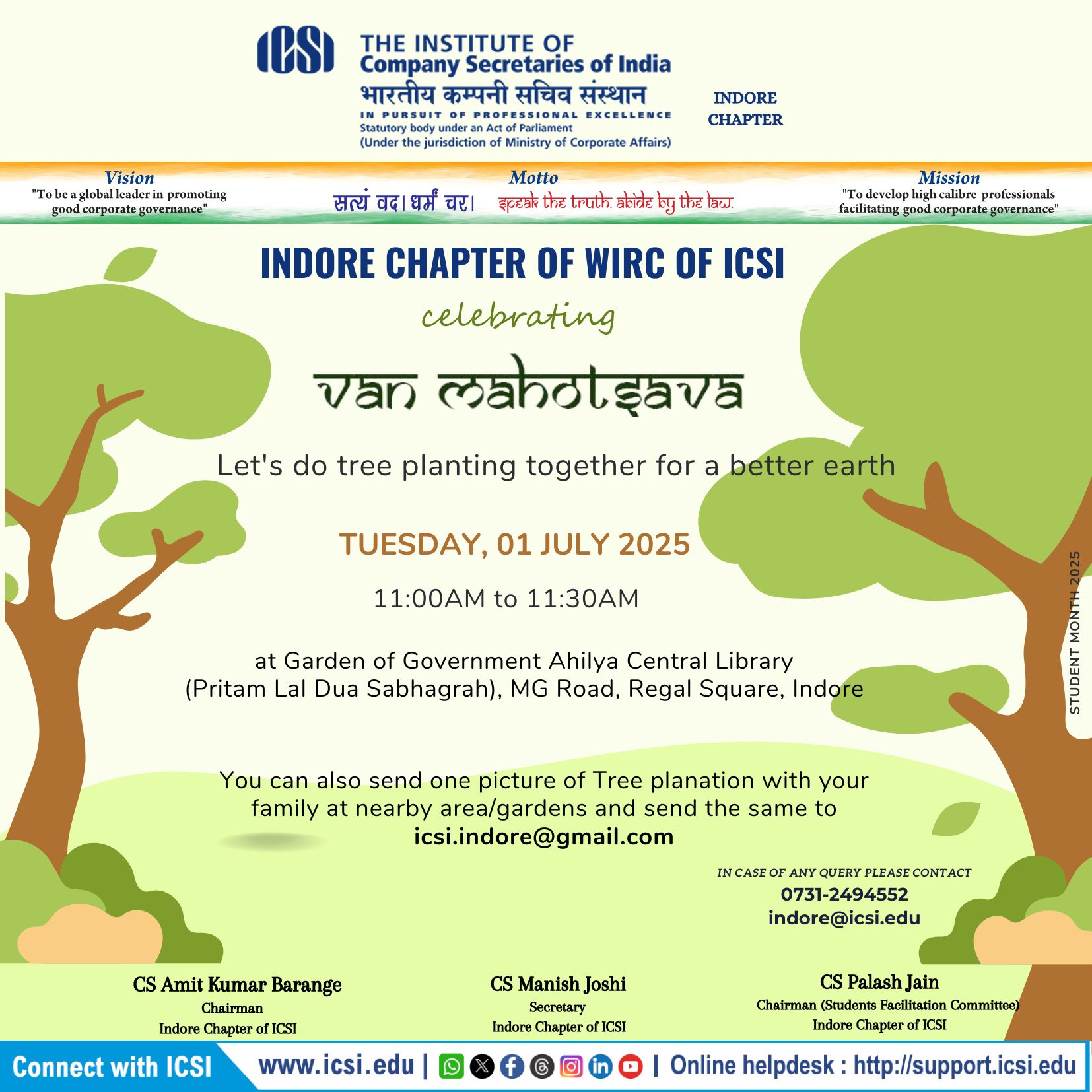 • Student Month is an opportunity for the students to interact with the Institute. The students have been enthusiastically participating in the various activities during the Student Month. In context to that Indore Chapter is celebrating Van Mohatsav on 01st July, 2025 to raise awareness among individuals regarding the importance of trees and inspire citizens to plant more of them. You are to requested to join at large to make the event successful