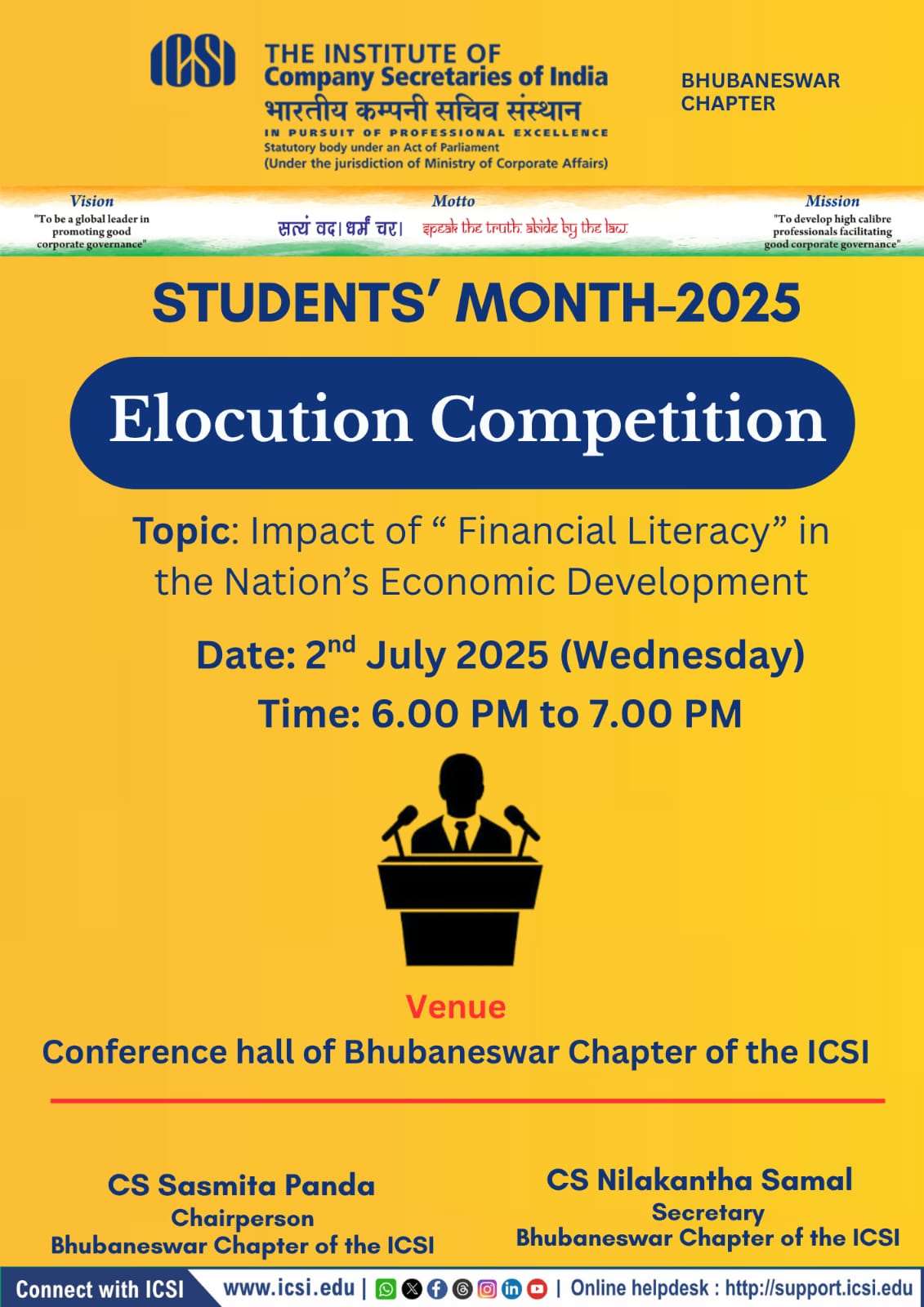 Bhubaneswar Chapter Organizing- Elocution Competition will be held on 02nd July, 2025 at Chapter Office Premises at 06.00 p.m to 07.00 p.m.