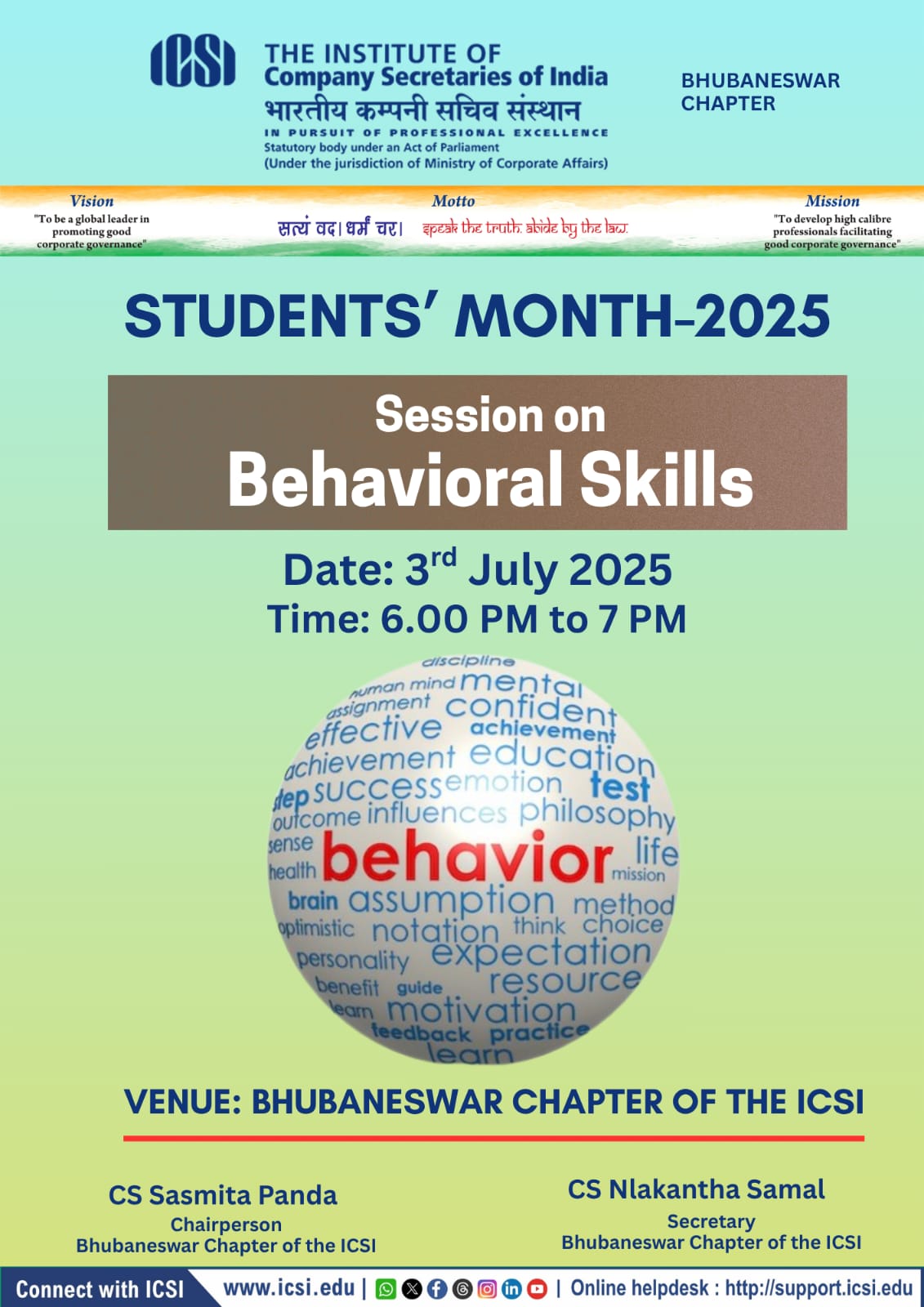 • Bhubaneswar Chapter Organizing- Session on " Behavioral Skills on 03rd July, 2025 at 06.00 p.m to 07.00 p.m at Chapter Office Premises. All Students are attend the program and a grand success.