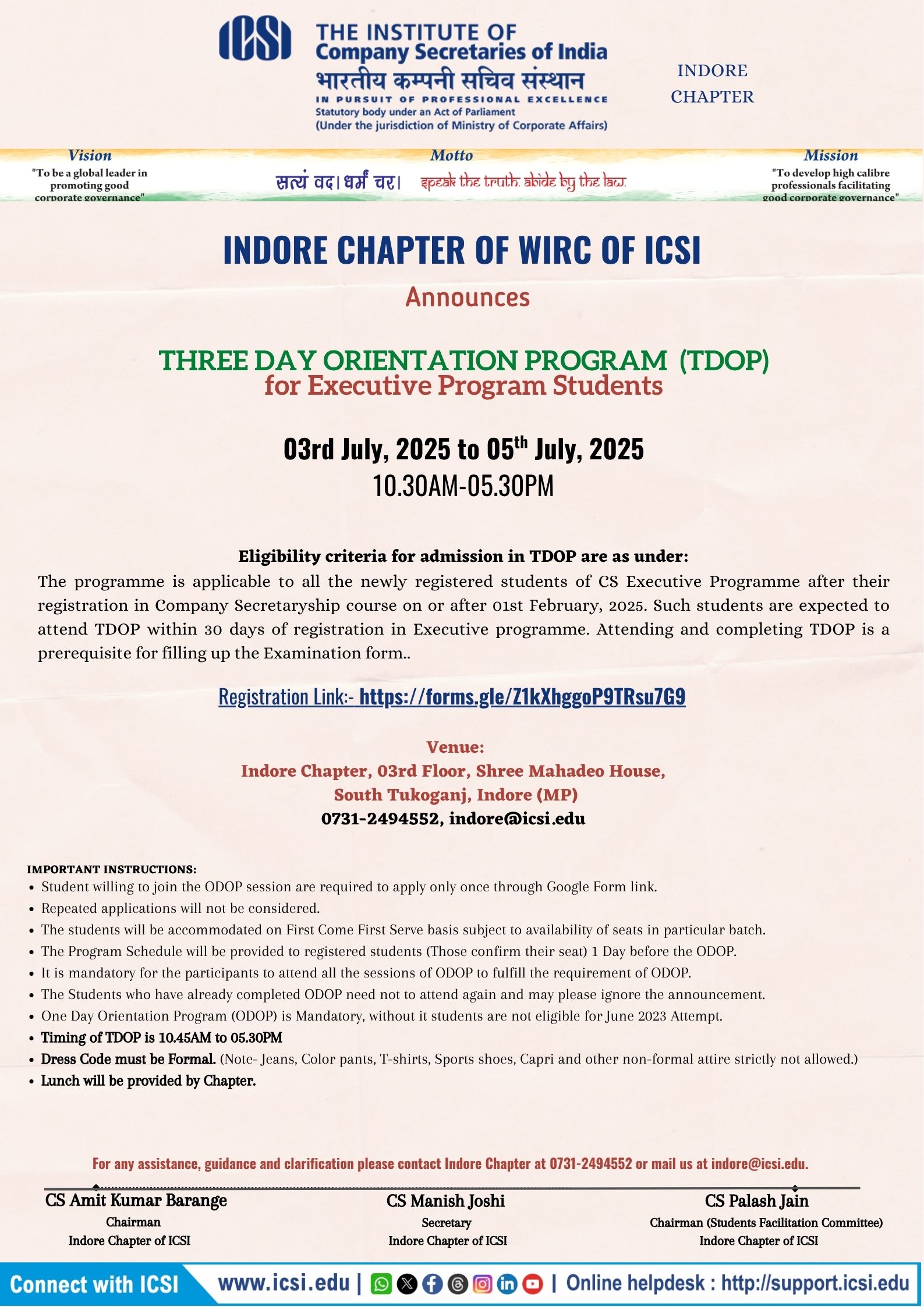 • The programme is applicable to all the newly registered students of CS Executive Programme after their registration in Company Secretaryship course on or after 01st February, 2025. Such students are expected to attend TDOP within 30 days of registration in Executive programme. Attending and completing TDOP is a prerequisite for filling up the Examination form. The duration of TDOP shall be three days. No leave is admissible during the duration of the programme.