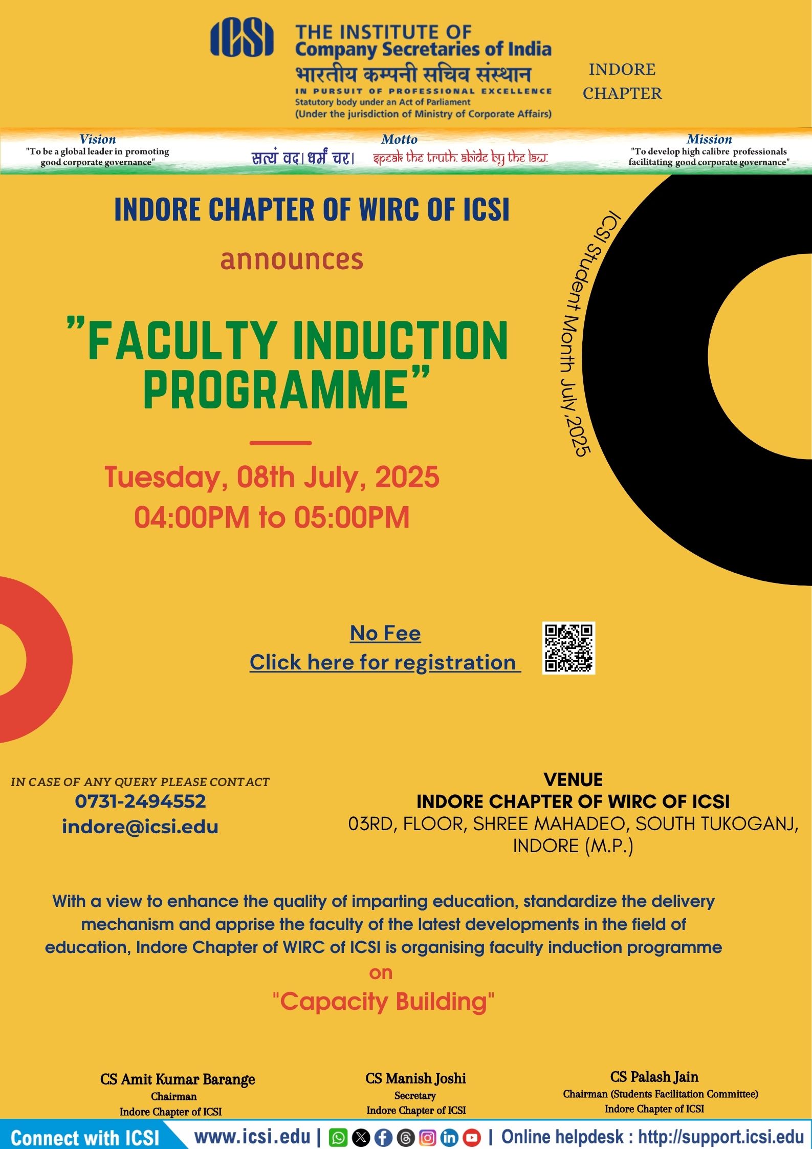 - Student Month is an opportunity for the students to interact with the Institute. The students have been enthusiastically participating in the various activities during the Student Month. In context to that Indore Chapter is organizing a "Faculty Induction Programme" on 08.07.2025. No. Fee. We encourage faculties to participate and make the most of this enriching experience. Looking forward to your presence