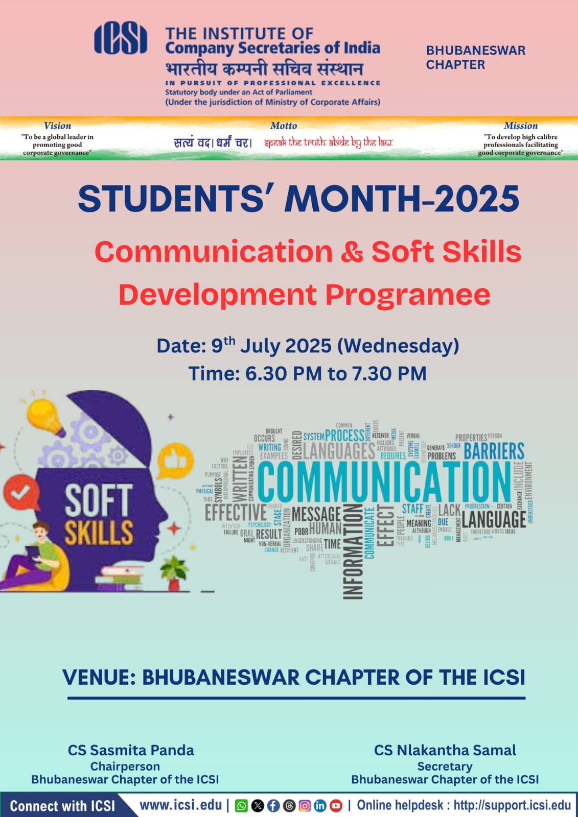 - Bhubaneswar Chapter Organizing- Communication Soft Skill Development Program on 09th July, 2025 at 06.30 p.m to 07.30 p.m at Chapter Office Premises. All students are attend the program during the Students Month Activities at Chapter Office Premises.