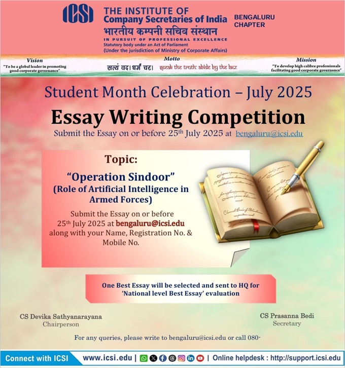 Submit the Essay on or before 25th July 2025 at bengaluru@icsi.edu Topic: “Operation Sindoor” (Role of Artificial Intelligence in Armed Forces)